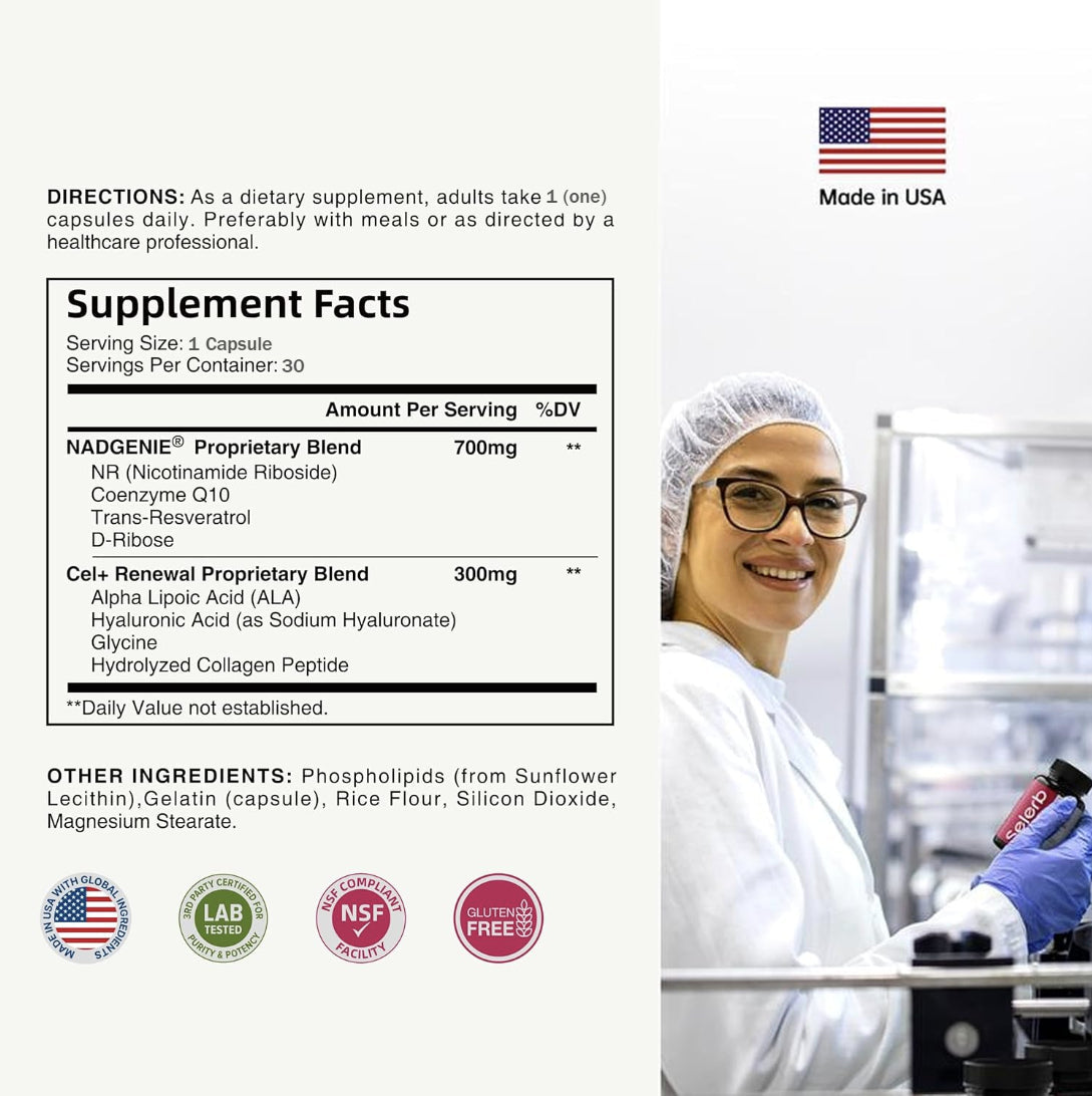 Restores cellular energy. NAD+ plays a key role in over 400 metabolic functions, helping you feel energized, mentally sharp, and physically active throughout the day.
